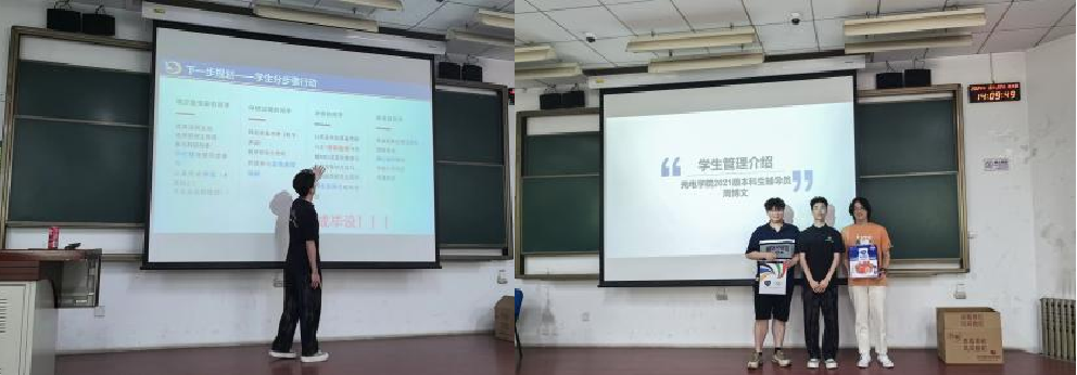 周博文针对2021级本科生即将返回中关村,为同学们介绍了中关村和光电学院的基本情况,并为同学们梳理了大四学年的重要时间节点,为不同情况的同学进行初步规划。他鼓励同学们坚持完成这大学本科生涯中的最后一公里,坚持迎难而上,不惧困难。尽情的展现自我,锻炼自我,成长自我,为本科生涯书写最完美的结尾。发言结束后抽签为获奖同学赠送奖品。